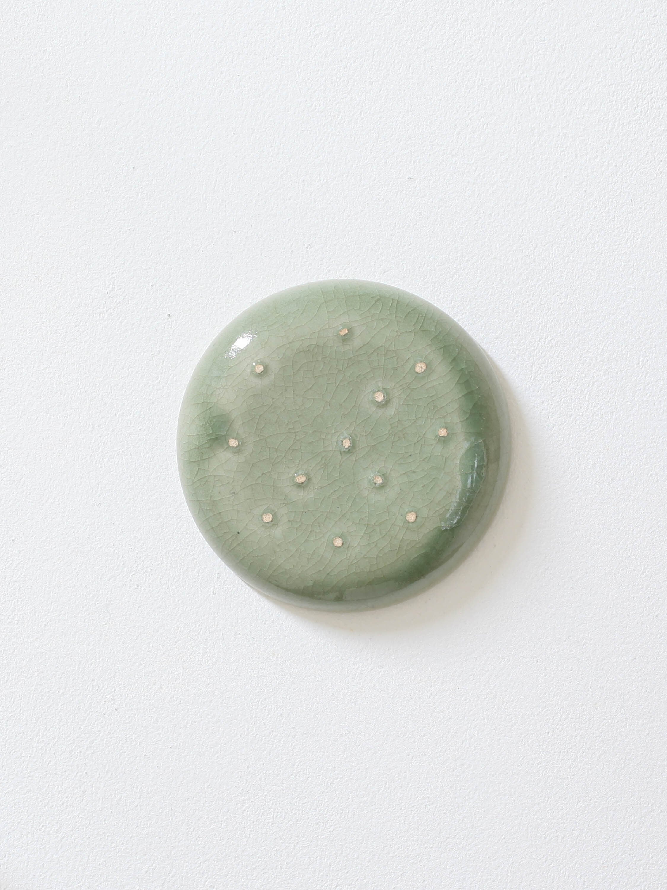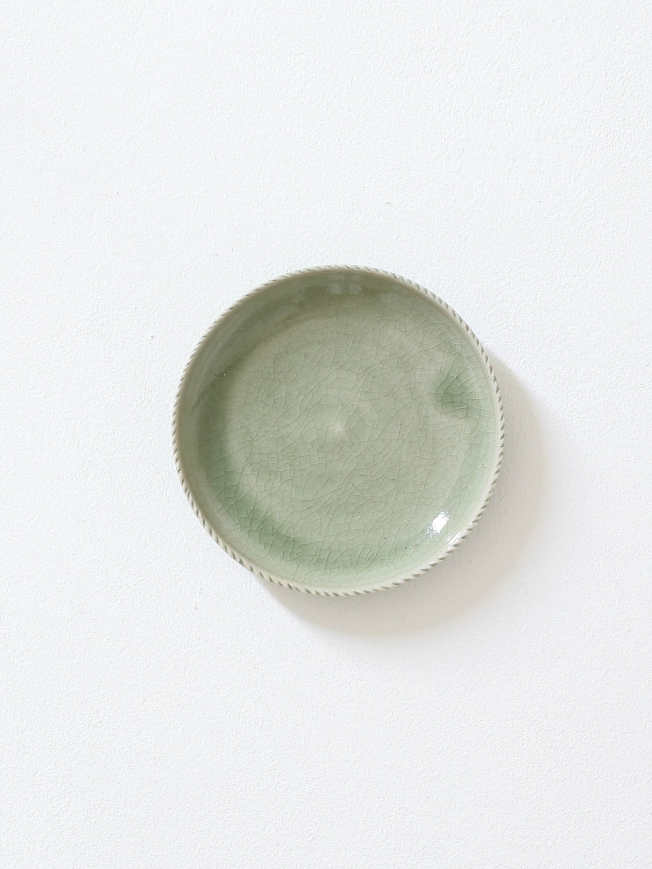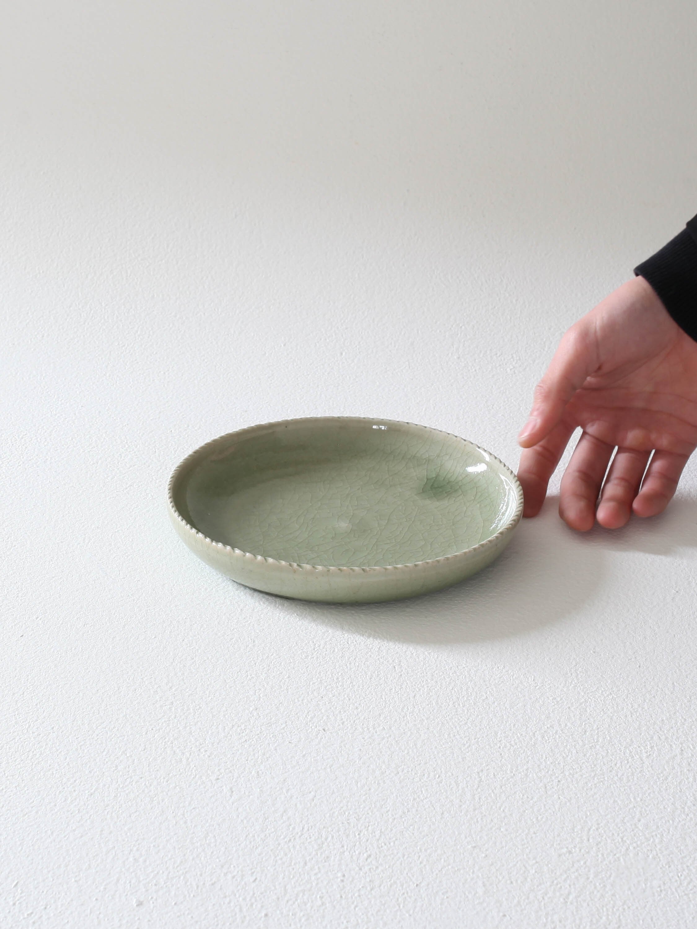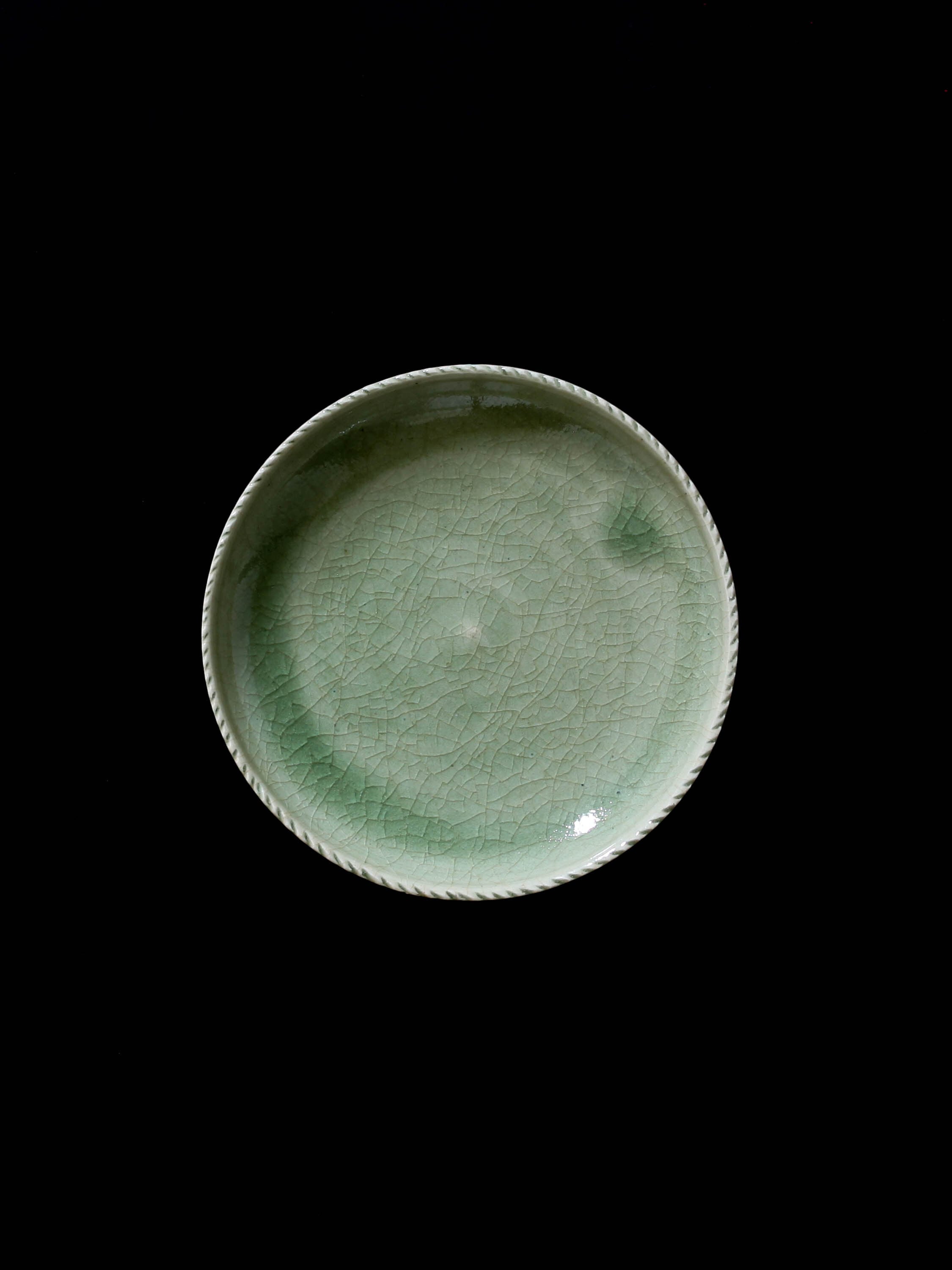 樫の木の灰から作る青磁の釉薬を厚く掛け、二度焼することで、上品かつ変化のある釉薬の景色が生まれた作品です。