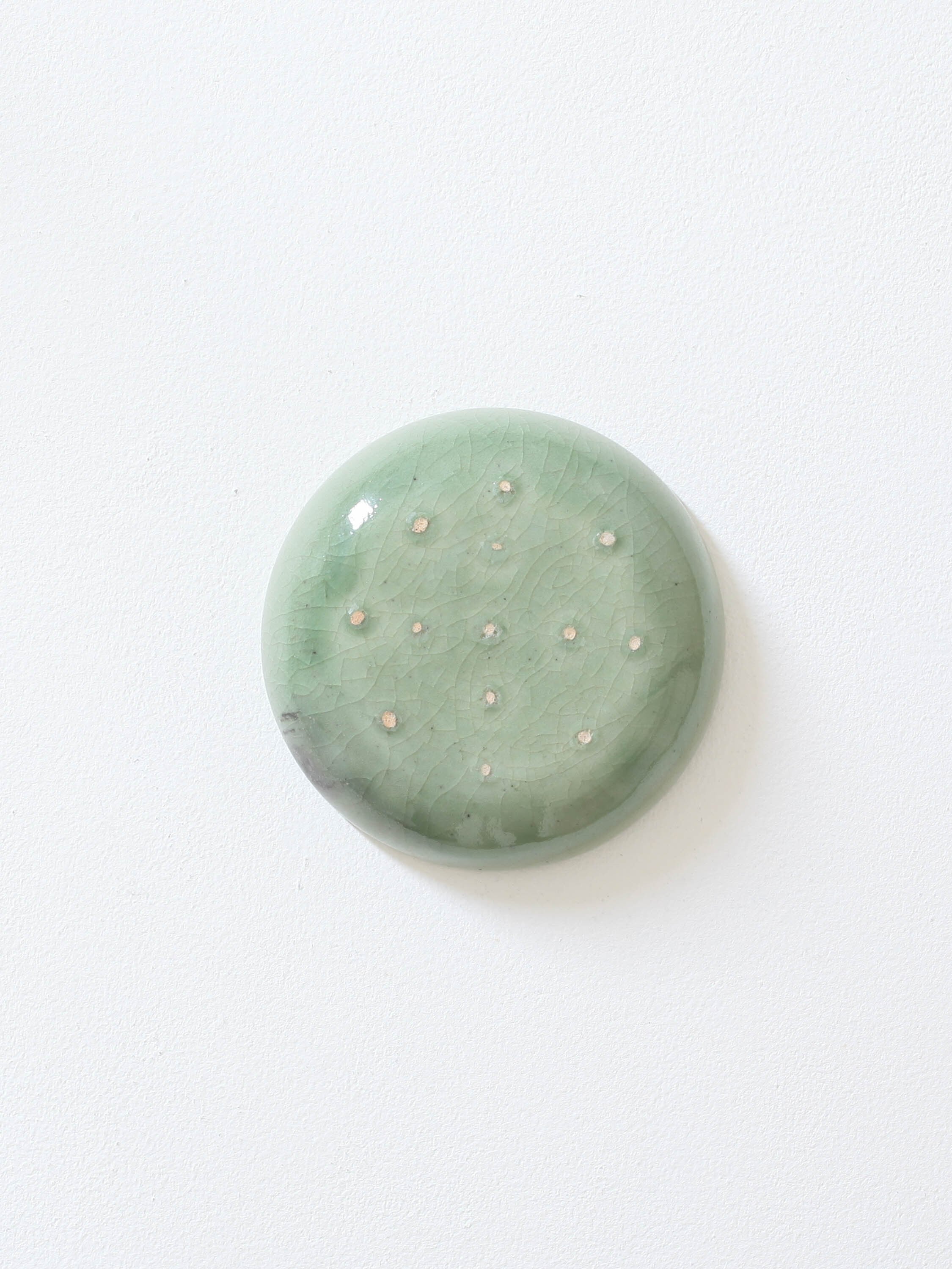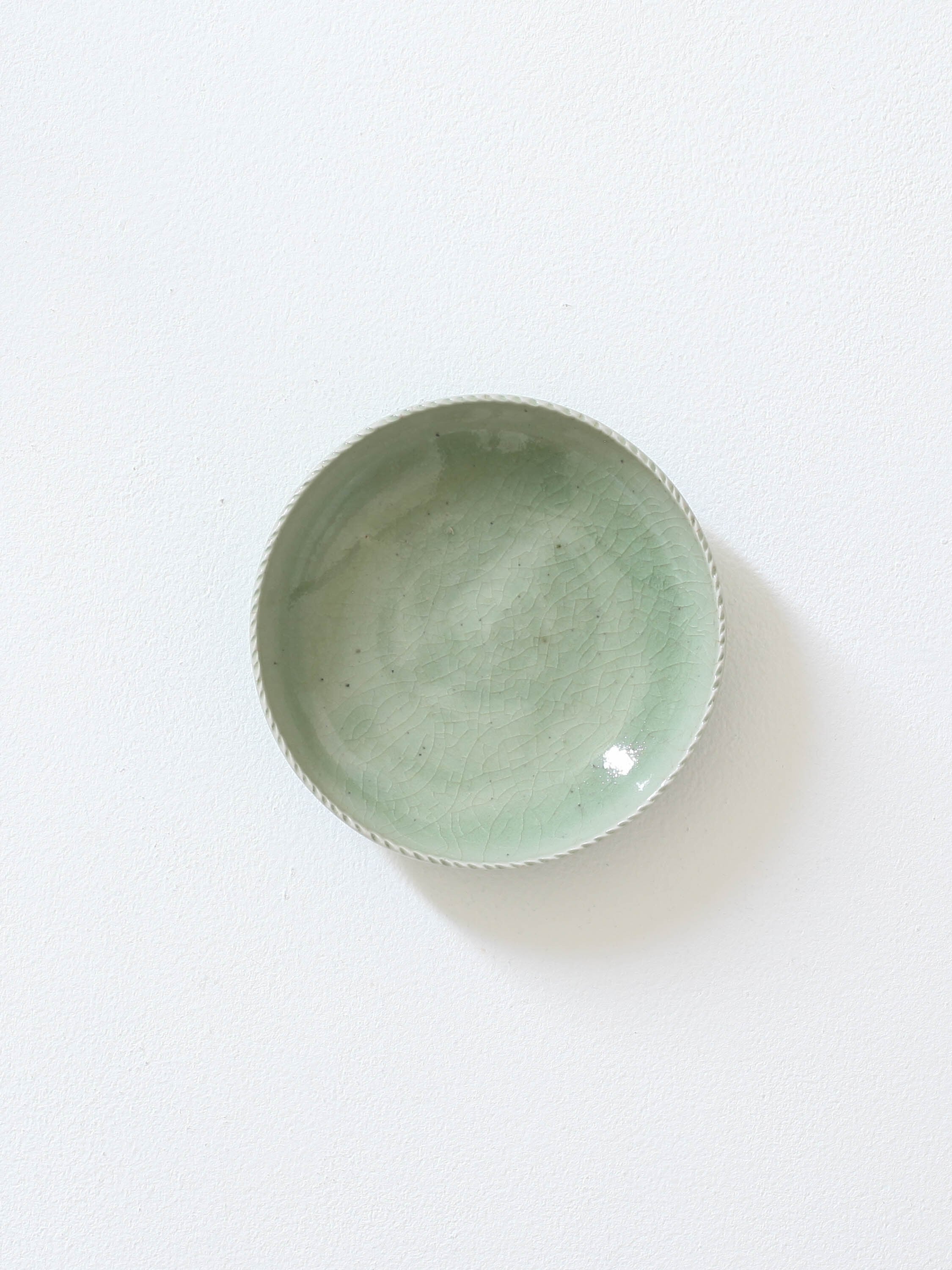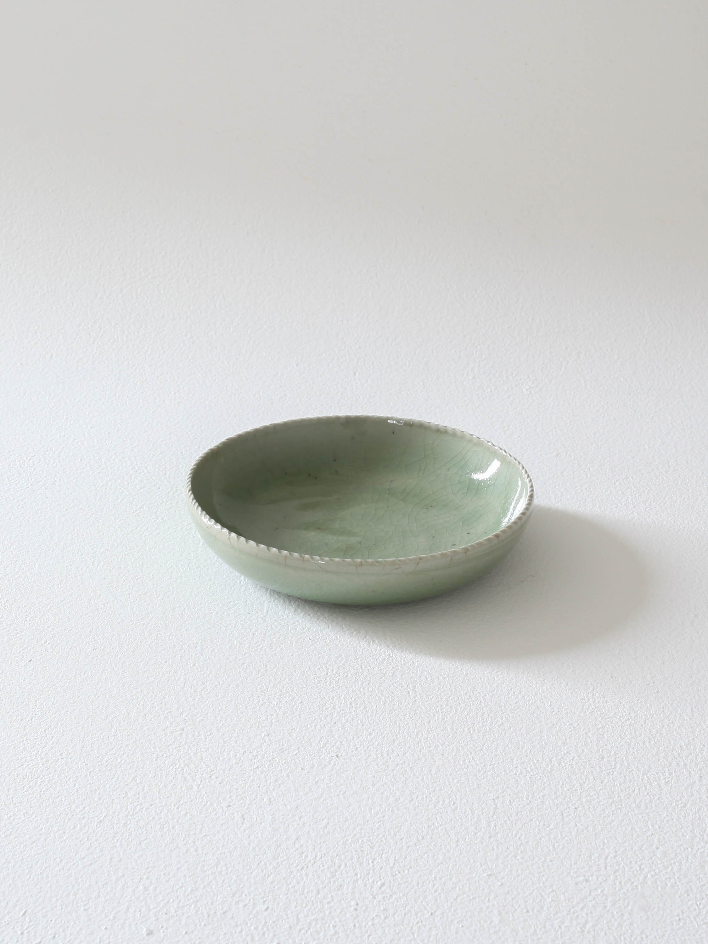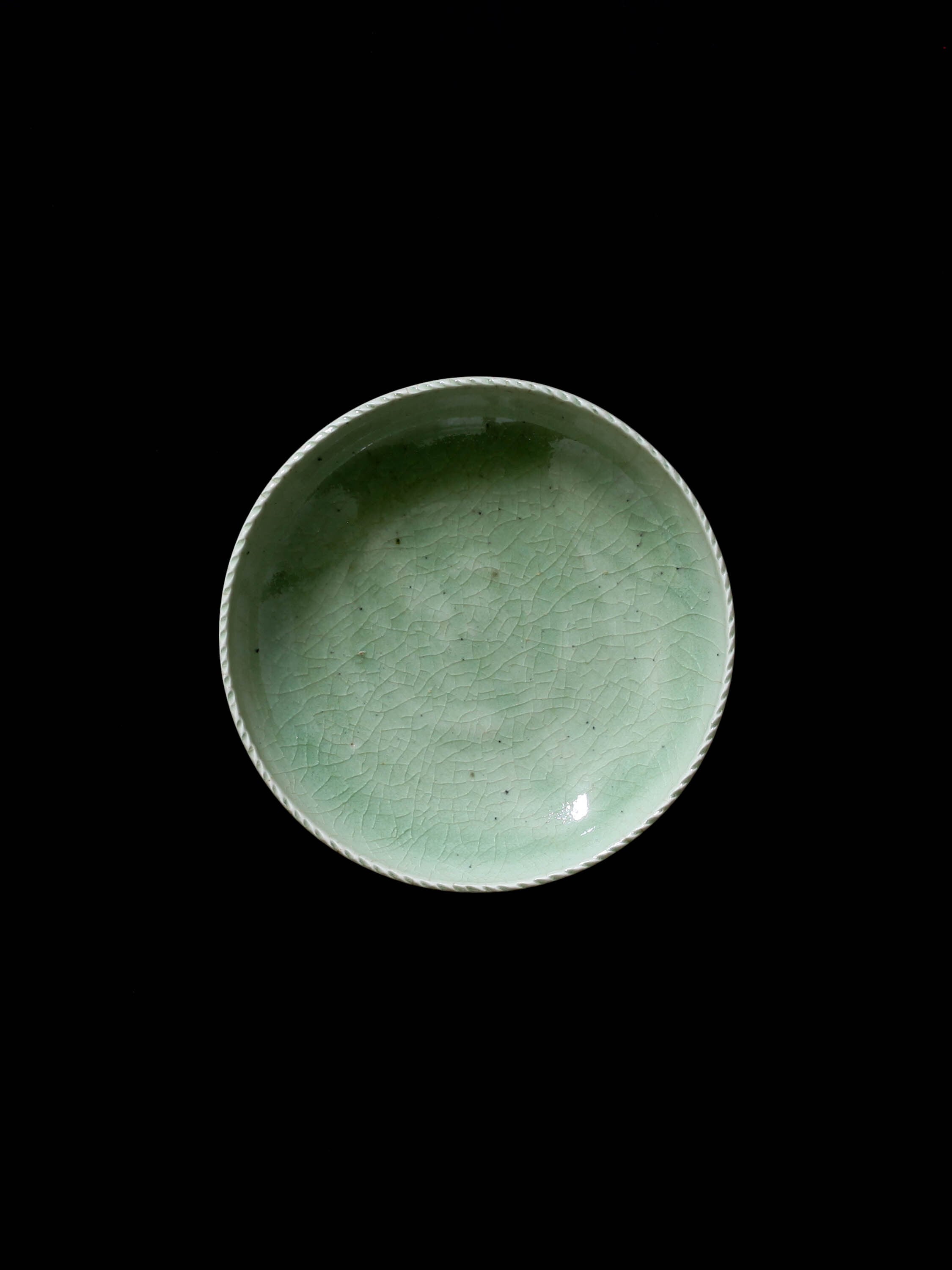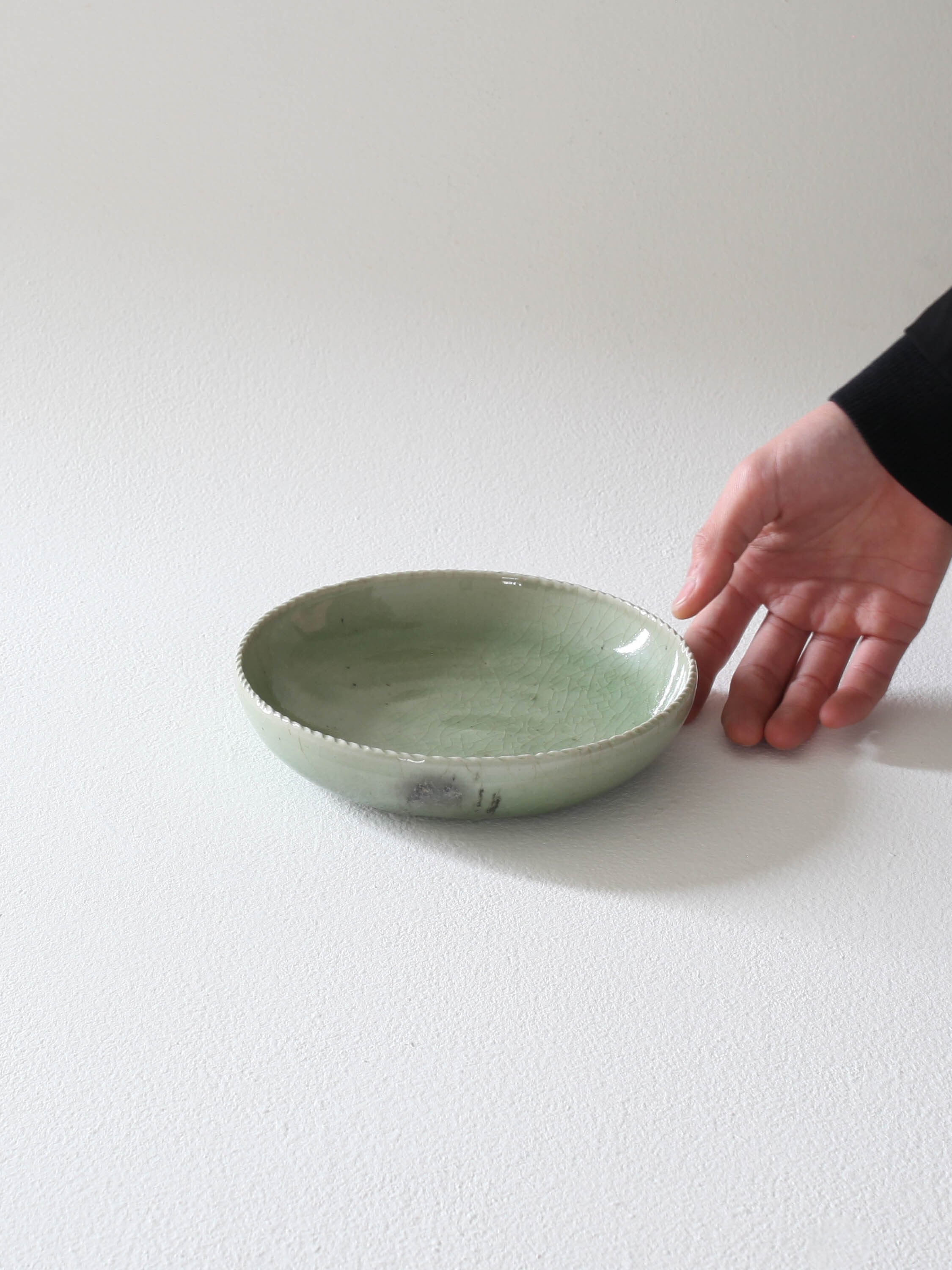 樫の木の灰から作る青磁の釉薬を厚く掛け、二度焼することで、上品かつ変化のある釉薬の景色が生まれた作品です。