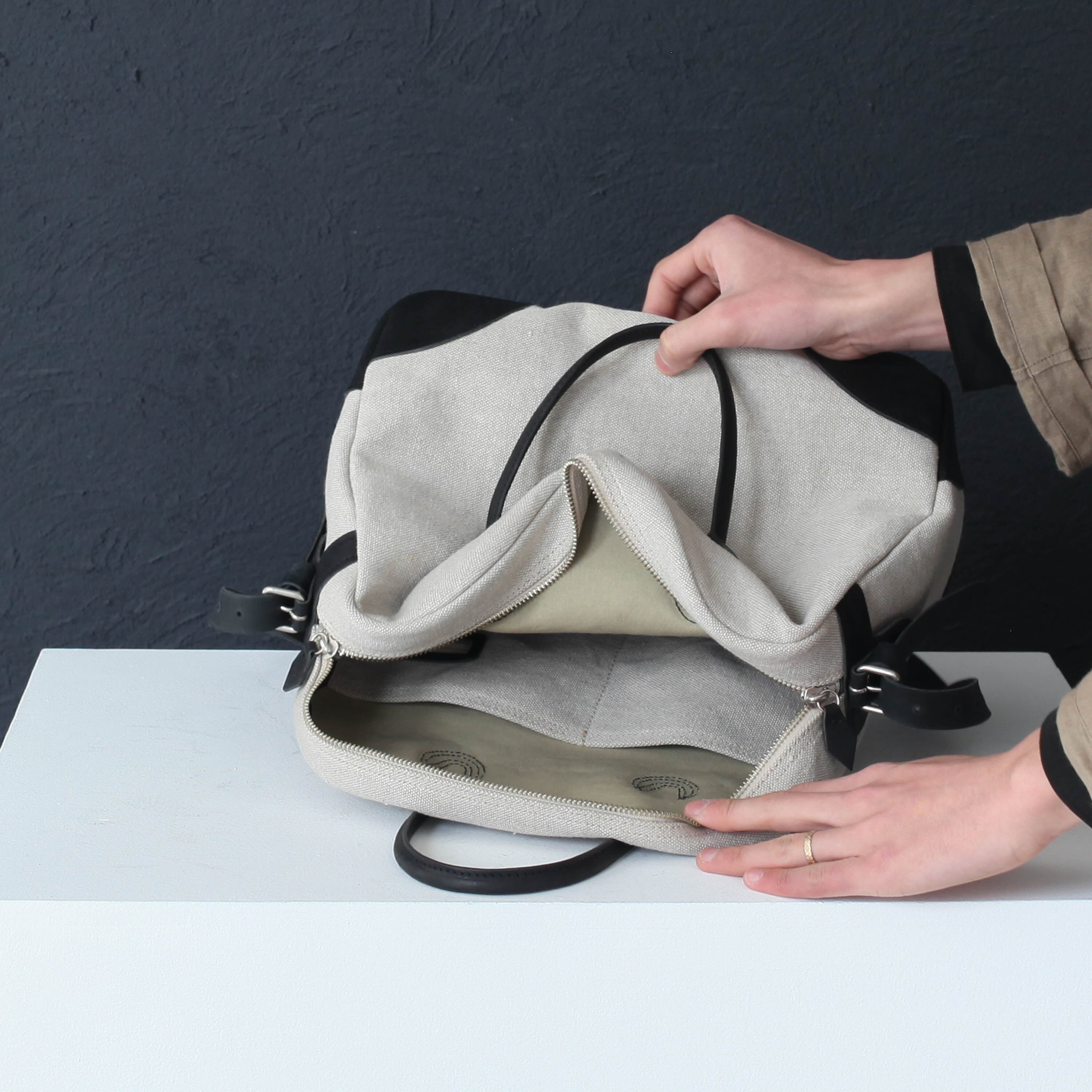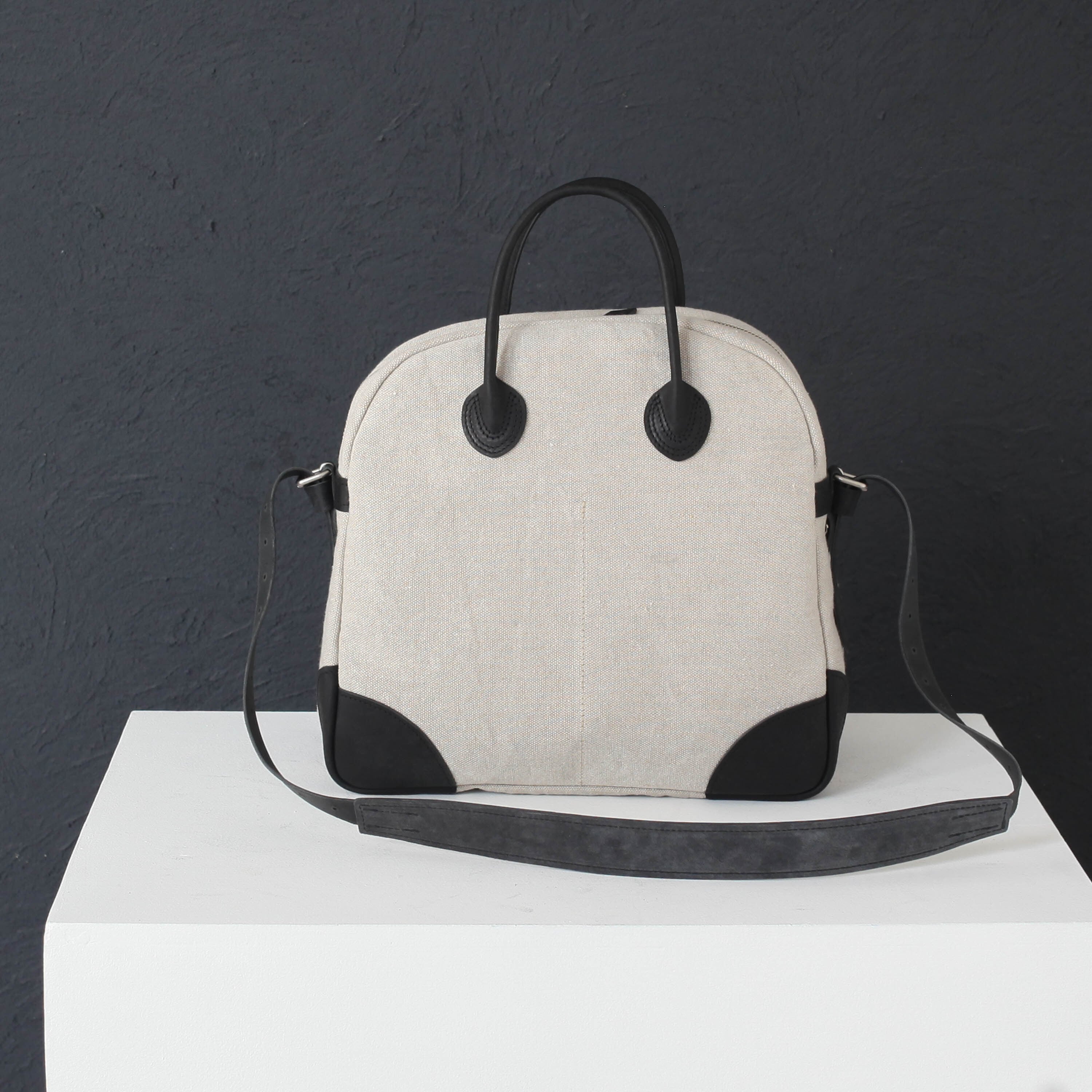 革はイタリアの最高級レザー、布は絵画のキャンバスにも使われる麻布を使用しています。