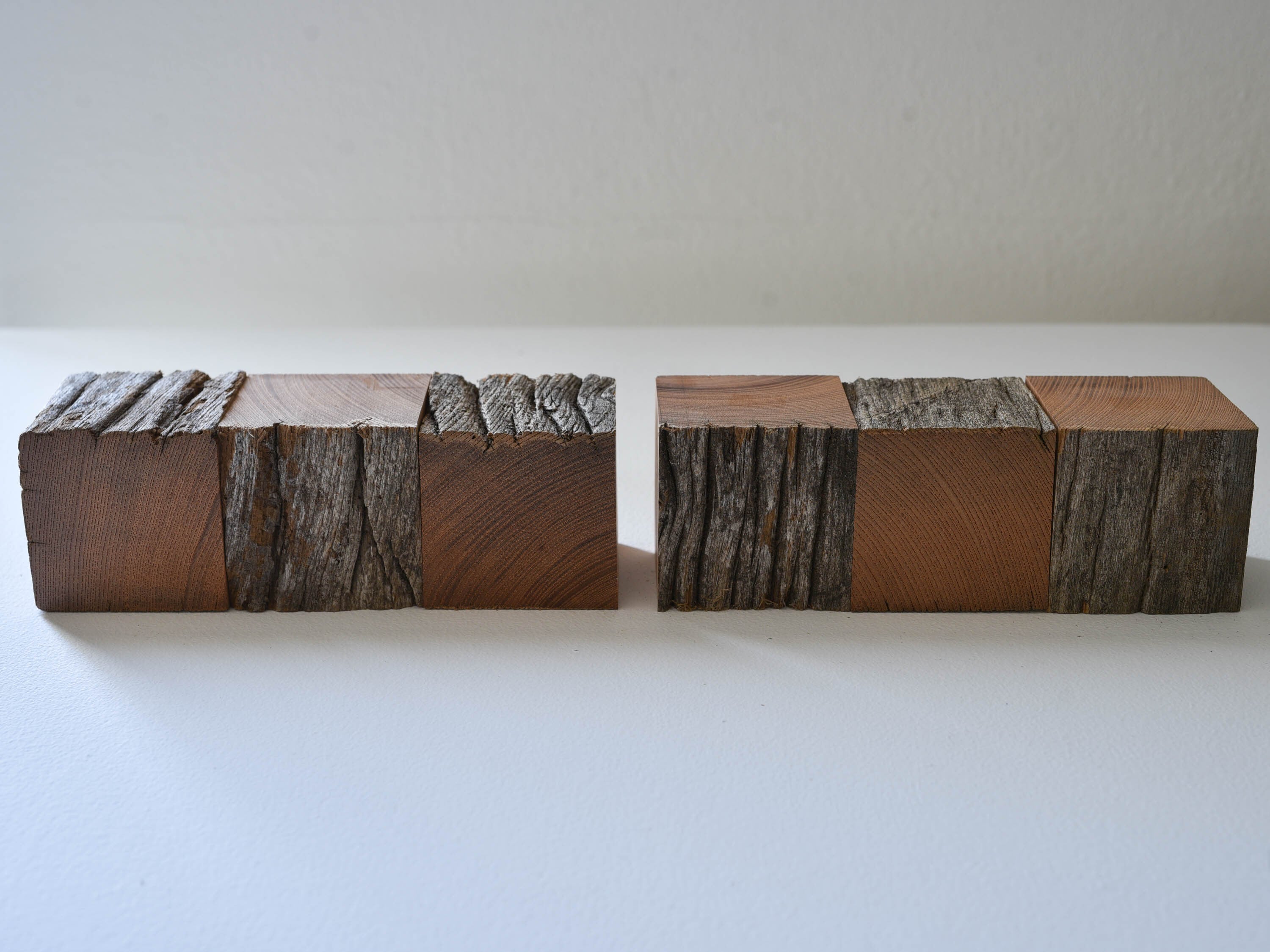 DM裏面のブロック材は長い間、雨風に晒された面と切ったすぐの面を同時に見せた時間軸の