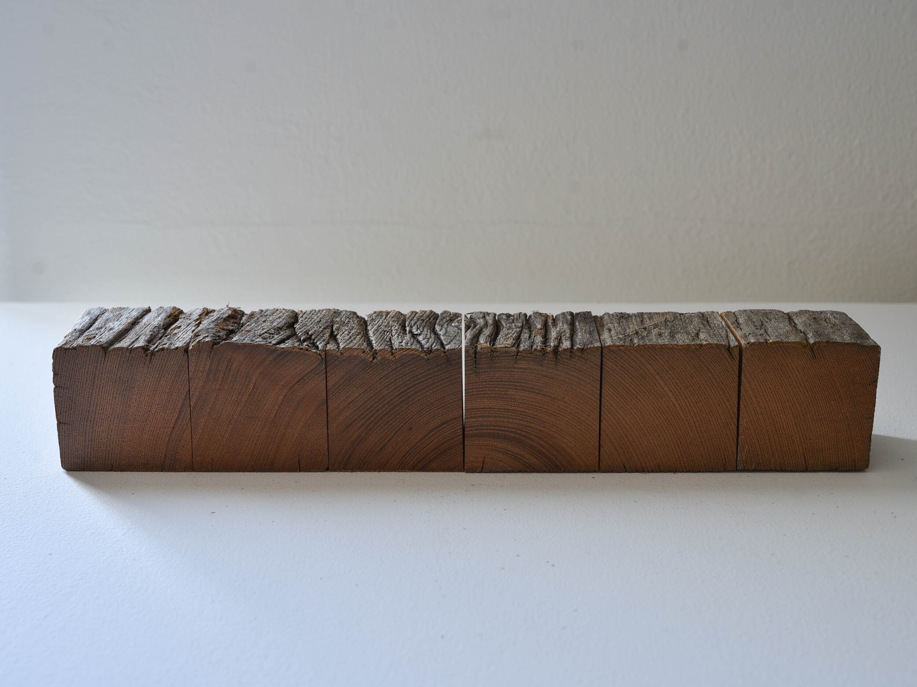 「同じ古材を刻んで、350年風雨に晒され続けた面と、切ったすぐの生まれたての面を同時に見せる、時間をテーマにした作品」。